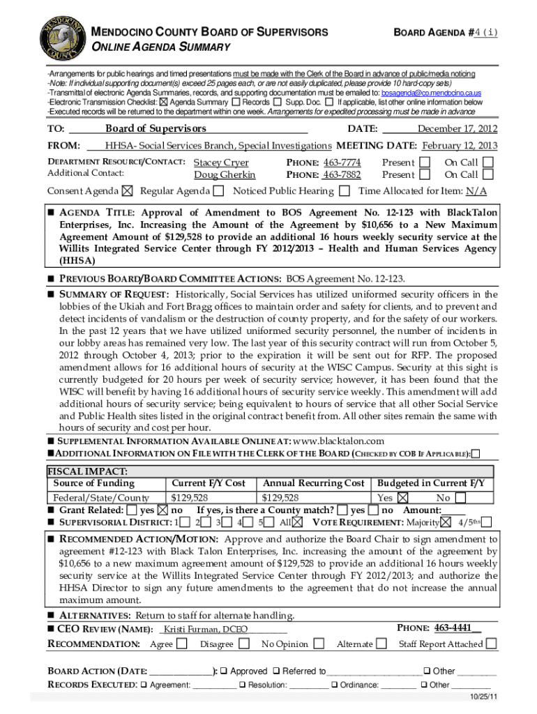 MENDOCINO COUNTY BOARD OF SUPERVISORS ONLINE AGENDA SUMMARY4(i) BOARD AGENDA #___Arrangements for public hearings and timed presentations must be made with the Clerk of the Board in advance of public/media