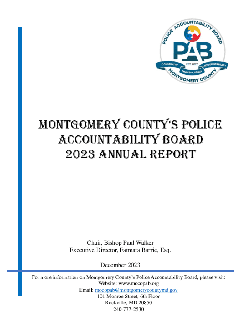 MONTGOMERY COUNTYS POLICE ACCOUNTABILITY BOARD 2023 ANNUAL REPORTChair, Bishop Paul Walker Executive Director, Fatmata Barrie, Esq. December 2023 For more information on Montgomery Countys Police
