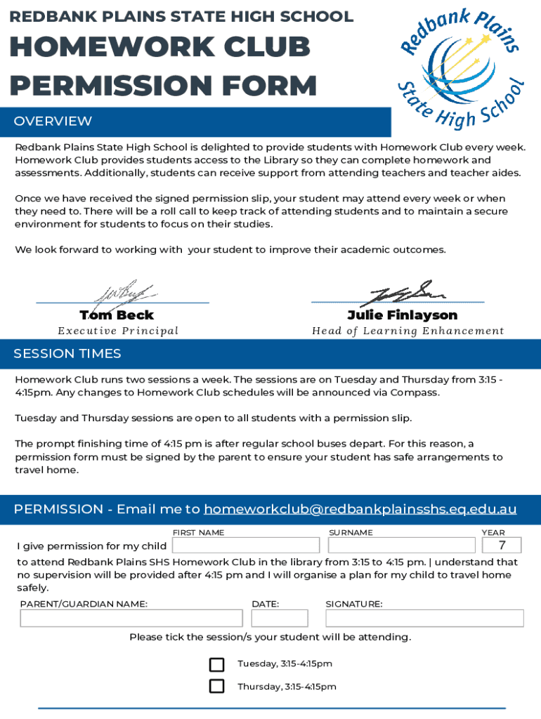 REDBANK PLAINS STATE HIGH SCHOOLHOMEWORK CLUB PERMISSION FORM OVERVIEW Redbank Plains State High School is delighted to provide students with Homework Club every week. Homework Club provides students