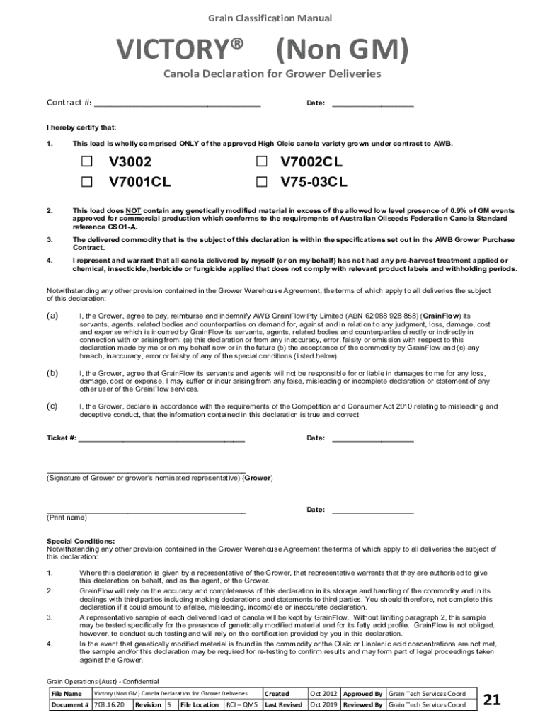 Canola Declaration for Grower DeliveriesContract #: ___Date:___I hereby certify that: