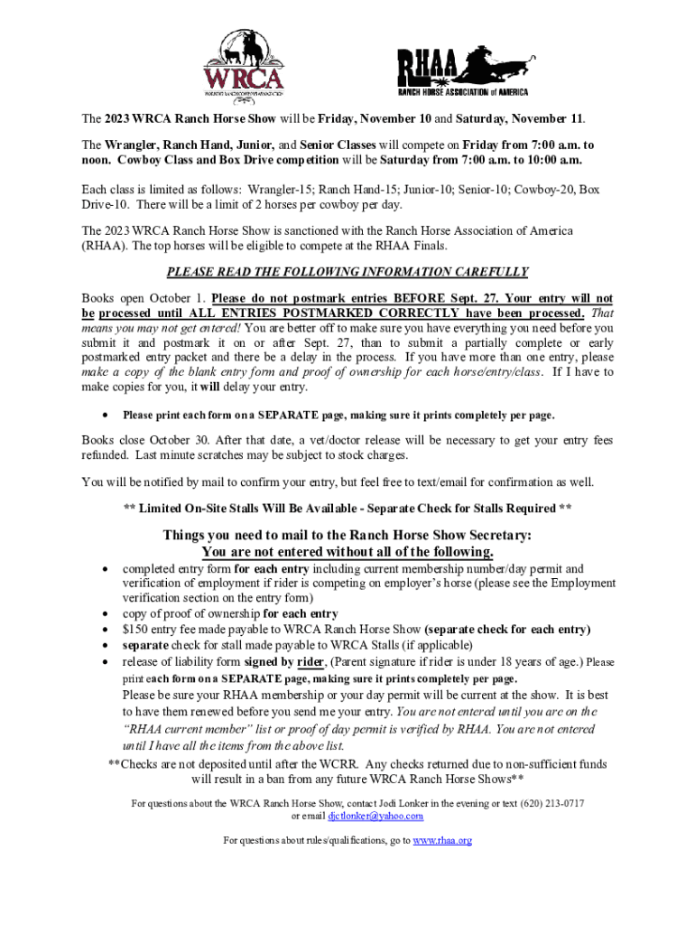 The 2023 WRCA Ranch Horse Show will be Friday, November 10 and Saturday, November 11. The Wrangler, Ranch Hand, Junior, and Senior Classes will compete on Friday from 7:00 a.m. to noon. Cowboy Class