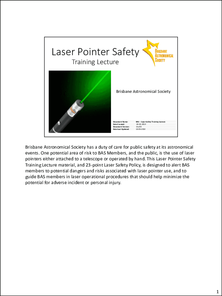 Laser Pointer Safety Training LectureBrisbane Astronomical SocietyDocument Name: Date Created: Document Version: Date Last Updated:BAS Laser Safety Training Lecture 18022019 Draft3 19062019Brisbane