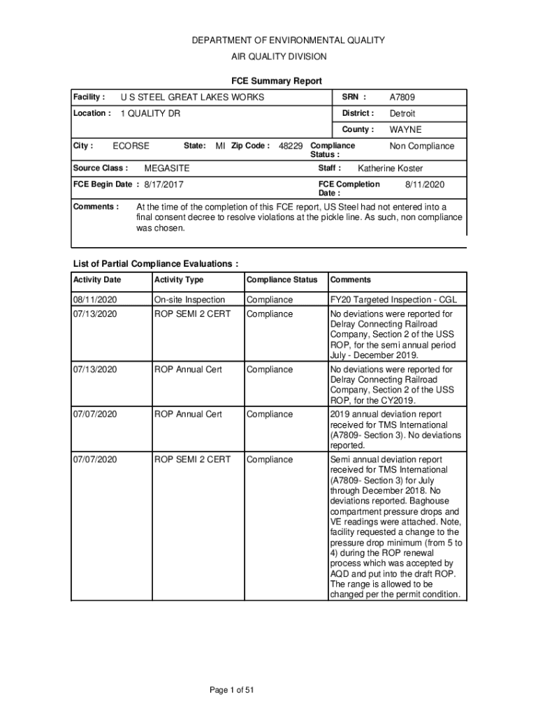DEPARTMENT OF ENVIRONMENTAL QUALITY AIR QUALITY DIVISION FCE Summary Report Facility :U S STEEL GREAT LAKES WORKSSRN :A7809Location :1 QUALITY DRDistrict :DetroitCounty :WAYNECity :State:ECORSEMI