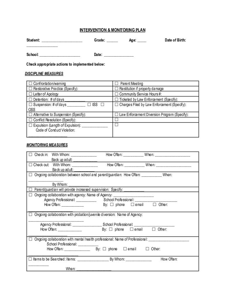 ___Grade: ___Age: ___School: ___Date: ___Date of Birth:Check appropriate actions to implemented below: