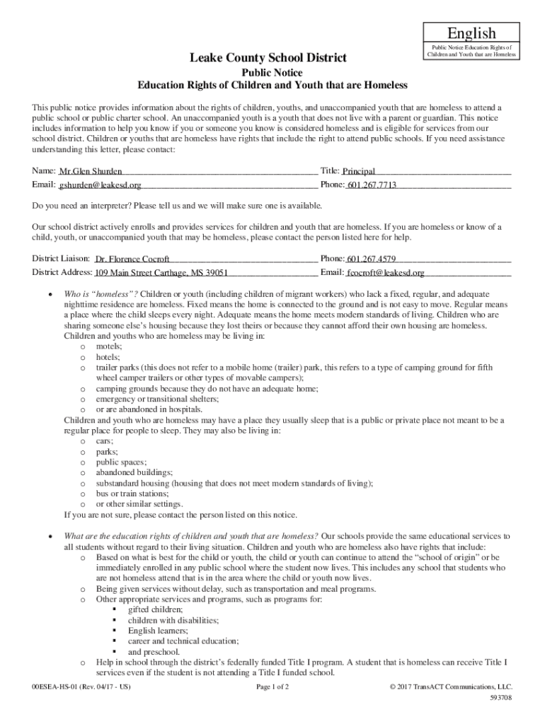 English Public Notice Education Rights of Children and Youth that are HomelessLeake County School District Public Notice Education Rights of Children and Youth that are HomelessThis public notice