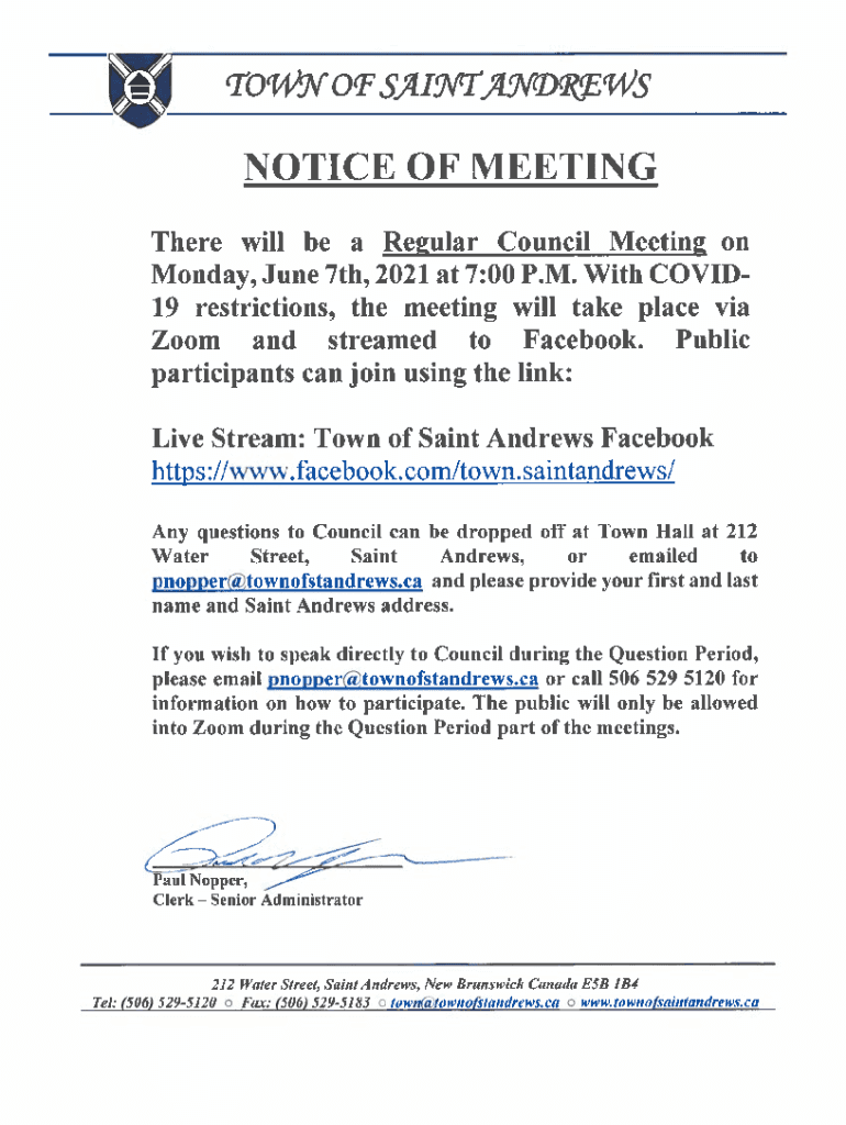 TOWN OF SAINT ANDREWS REGULAR COUNCIL MEETING AGENDA Monday, June 7, 2021, 7:00 p.m. Electronic Meeting Pages A.RECORDING OF ATTENDANCEB.APPROVAL OF AGENDA Recommended Motion: That the Agenda be