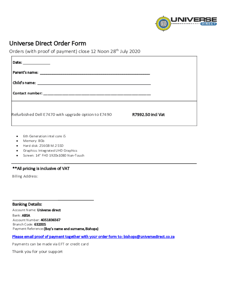 Universe Direct Order Form Orders (with proof of payment) close 12 Noon 28th July 2020 Date: Parent\'s name: ___ Childs name: Contact number: ___Refurbished Dell E7470 with upgrade option to E7490