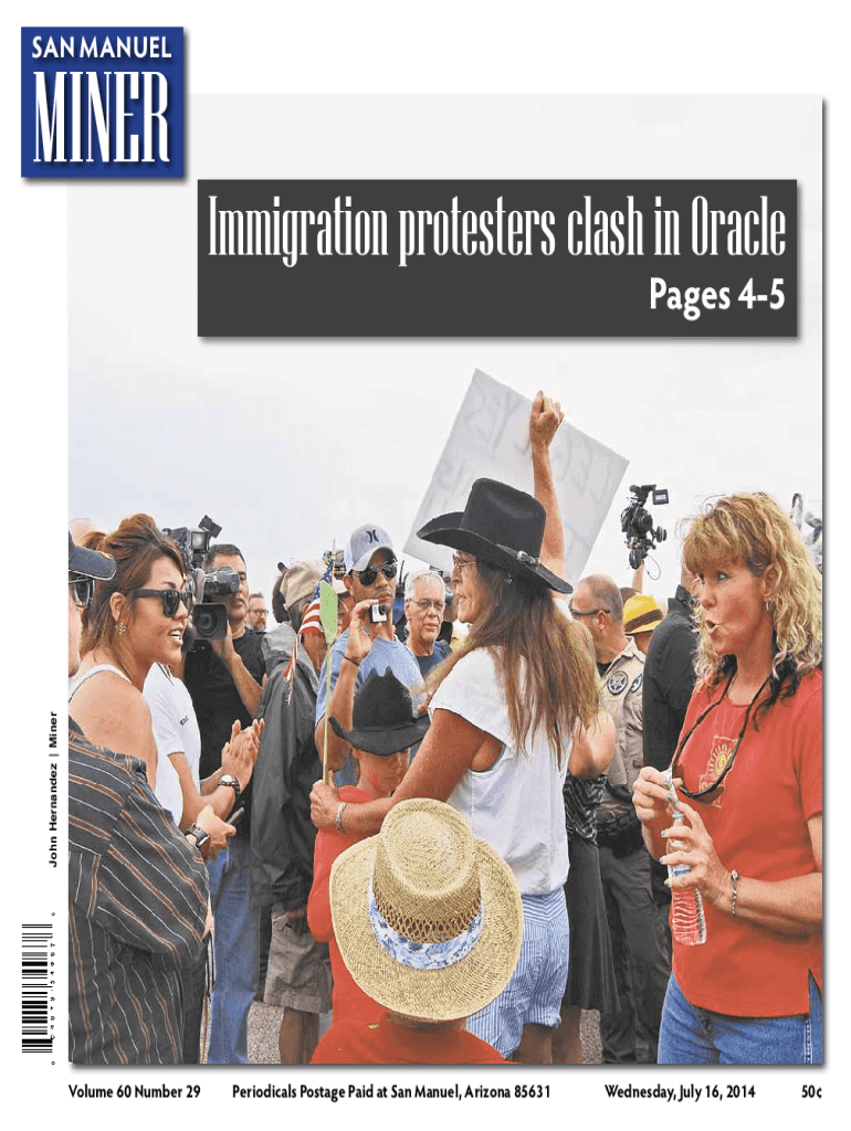 SAN MANUELMINERImmigration protesters clash in OracleJohn Hernandez | MinerPages 45Volume 60 Number 29Periodicals Postage Paid at San Manuel, Arizona 85631Wednesday, July 16, 2014502 | San Manuel