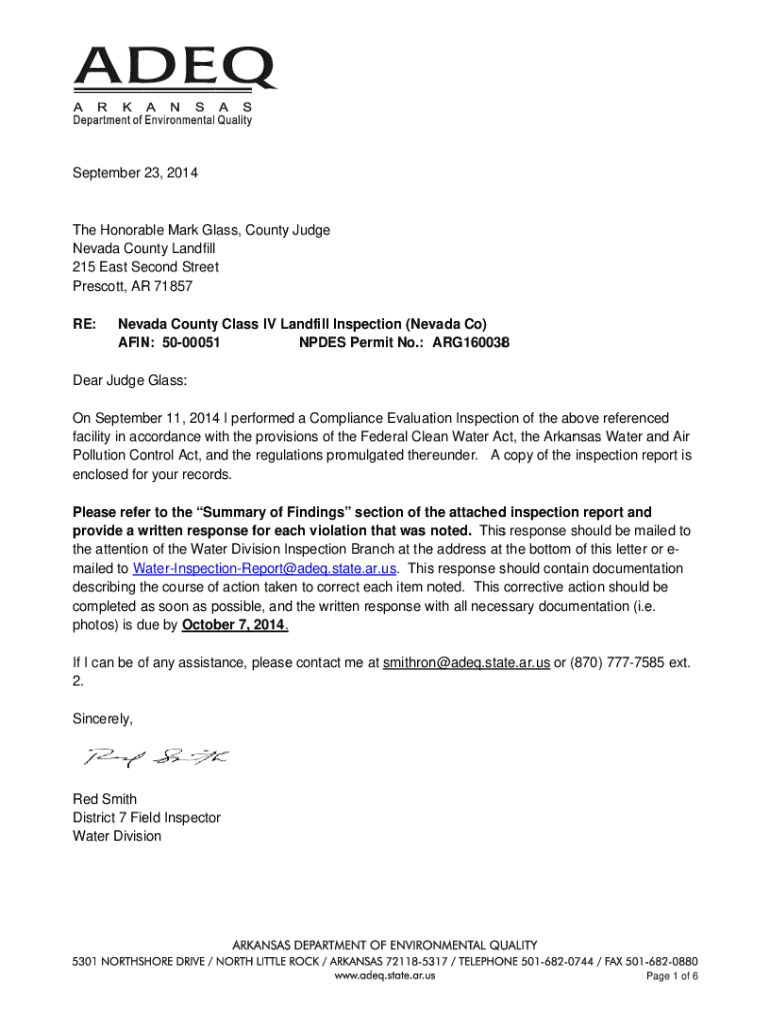 September 23, 2014able Mark Glass, County y Judge The Honora Nevada Cou unty Landfill 215 East Se econd Streett Prescott, AR R 71857 RE:Neva ada County y Class IV Landfill L Insp pection (Nev vada