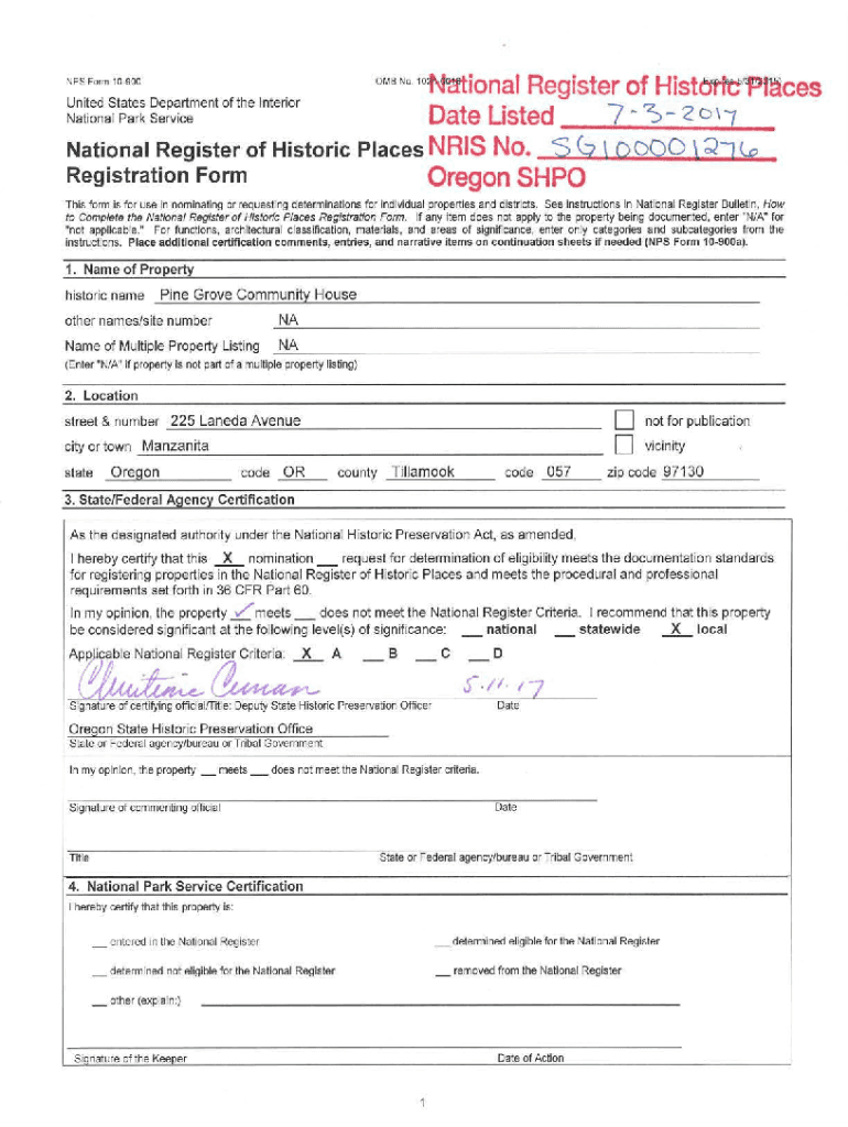 Nional Register of Histc5\'fte\'Pll:ices Date Listed 7 \'\"S 2. o v, National Register of Historic Places NRIS No. S G Q 000 J le Registration Form OregonSHPO NPS Form 10900oMs No.10United States