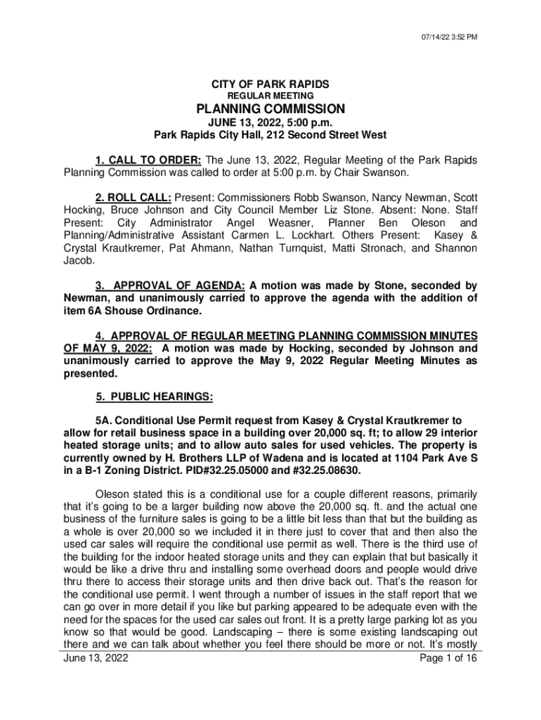 07/14/22 3:52 PMCITY OF PARK RAPIDS REGULAR MEETINGPLANNING COMMISSION JUNE 13, 2022, 5:00 p.m. Park Rapids City Hall, 212 Second Street West 1. CALL TO ORDER: The June 13, 2022, Regular Meeting of