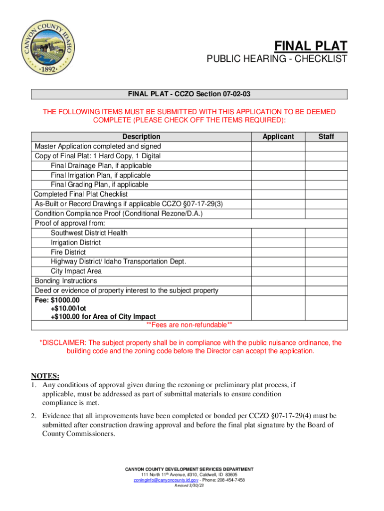 PUBLIC HEARING CHECKLISTFINAL PLAT CCO Section 070203