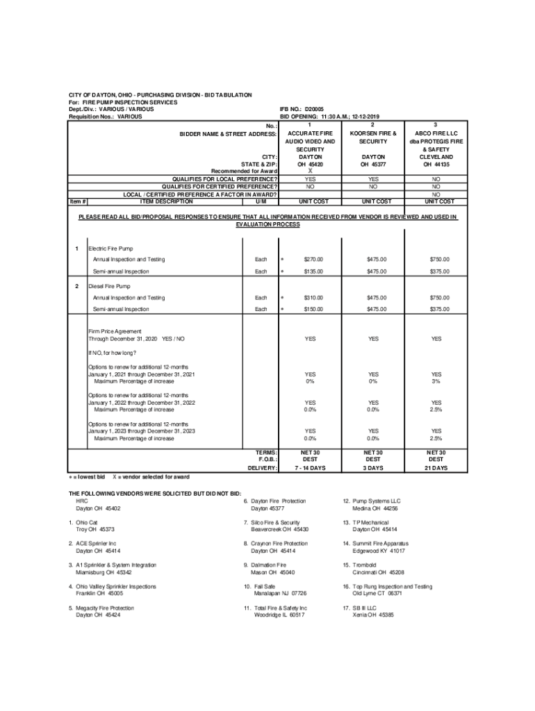 CITY OF DAYTON, OHIO PURCHASING DIVISION BID TABULATION For: FIRE PUMP INSPECTION SERVICES Dept./Div.: VARIOUS / VARIOUS Requisition Nos.: VARIOUS No.: BIDDER NAME & STREET ADDRESS:CITY: STATE & ZIP: