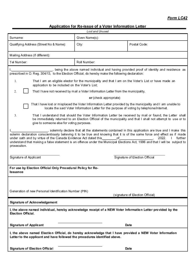 Form LC42 Application for Reissue of a Voter Information Letter Lost and UnusedSurname:Given Name(s):Qualifying Address (Street No & Name):City:Postal Code:Mailing Address (if different): Tel Number:Roll