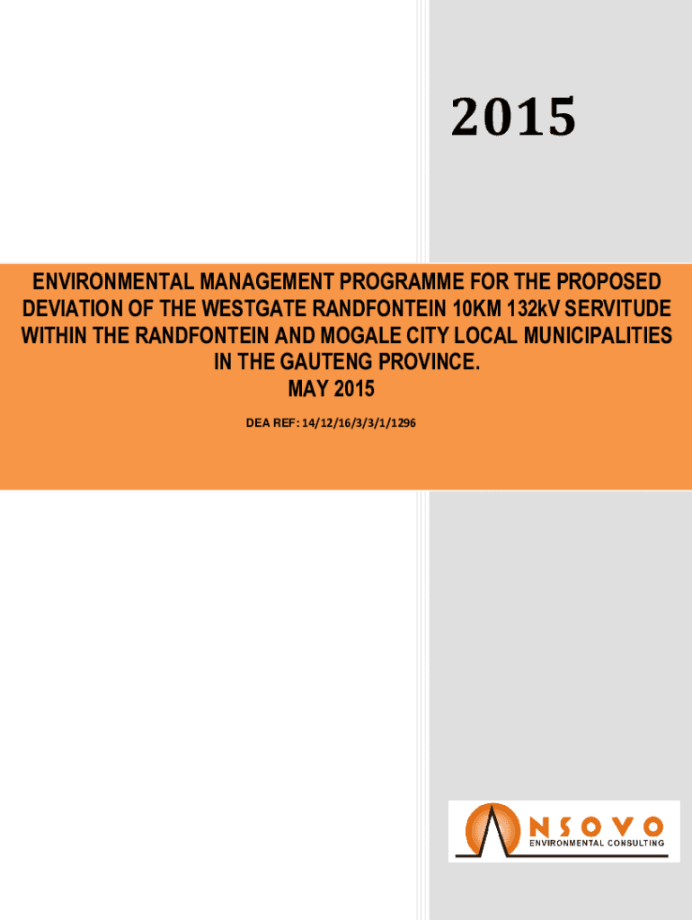 2015 ENVIRONMENTAL MANAGEMENT PROGRAMME FOR THE PROPOSED DEVIATION OF THE WESTGATE RANDFONTEIN 10KM 132kV SERVITUDE WITHIN THE RANDFONTEIN AND MOGALE CITY LOCAL MUNICIPALITIES IN THE GAUTENG PROVINCE.