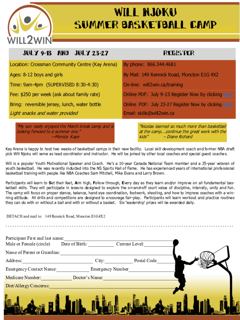 Will njoku SUMMER BASKETBALL camp July 913 and July 2327registerLocation: Crossman Community Centre (Kay Arena)By phone: 866.344.4681Ages: 812 boys and girlsBy Mail: 149 Rennick Road, Moncton E1G