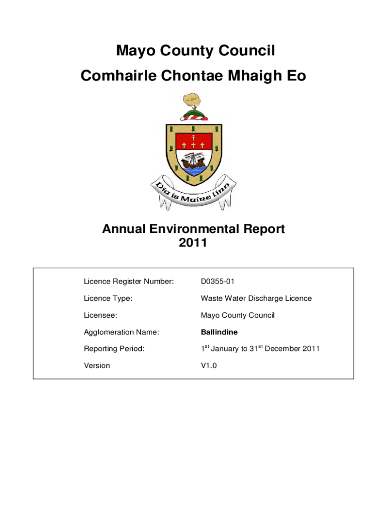 Mayo County Council Comhairle Chontae Mhaigh EoAnnual Environmental Report 2011 Licence Register Number:D035501Licence Type:Waste Water Discharge LicenceLicensee:Mayo County CouncilAgglomeration Name:BallindineReporting