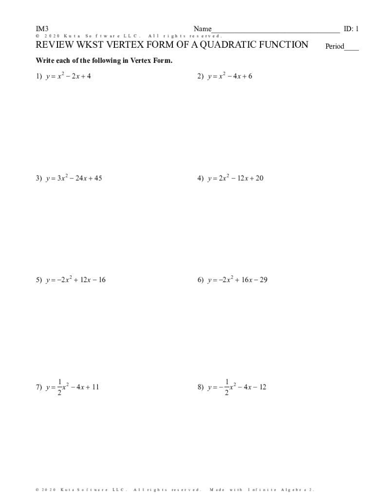 Get the free Infinite Algebra 2 - REVIEW WKST VERTEX FORM OF A QUADRATIC FUNCTION