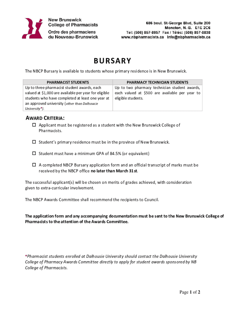 BURSARY The NBCP Bursary is available to students whose primary residence is in New Brunswick. PHARMACIST STUDENTS Up to three pharmacist student awards, each valued at $1,000 are available per year