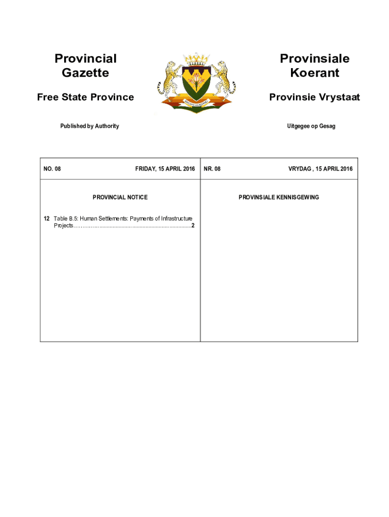 Provincial GazetteProvinsiale KoerantFree State ProvinceProvinsie VrystaatPublished by AuthorityNO. 08Uitgegee op GesagFRIDAY, 15 APRIL 2016PROVINCIAL NOTICE12 Table B.5: Human Settlements: Payments