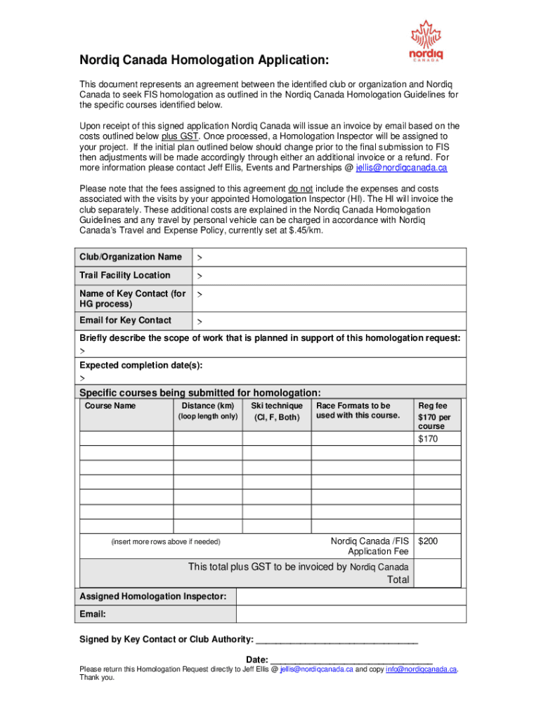 Nordiq Canada Homologation Application: This document represents an agreement between the identified club or organization and Nordiq Canada to seek FIS homologation as outlined in the Nordiq Canada