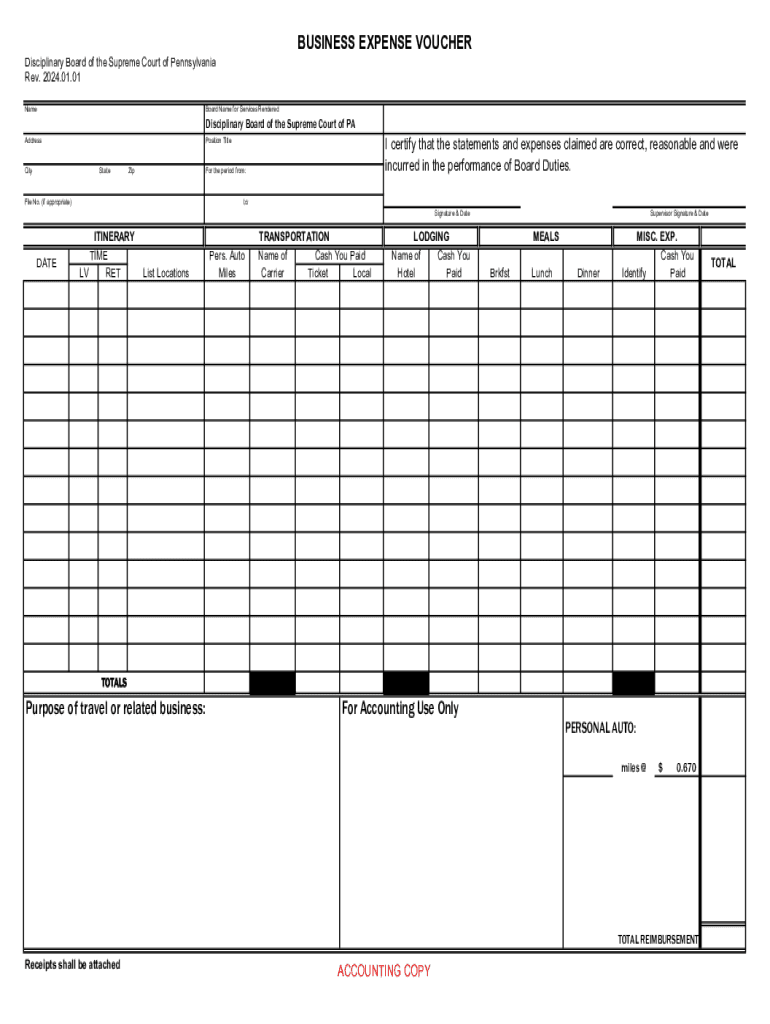BUSINESS EXPENSE VOUCHER Disciplinary Board of the Supreme Court of Pennsylvania Rev. 2024.01.01 NameBoard Name for Services RenderedAddressPosition TitleDisciplinary Board of the Supreme Court of