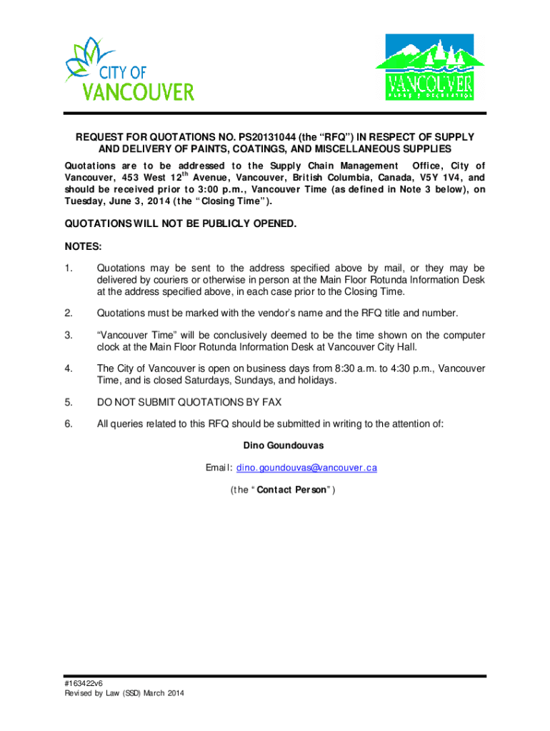 REQUEST FOR QUOTATIONS NO. PS20131044 (the RFQ) IN RESPECT OF SUPPLY AND DELIVERY OF PAINTS, COATINGS, AND MISCELLANEOUS SUPPLIES Quotations are to be addressed to the Supply Chain Management Office,
