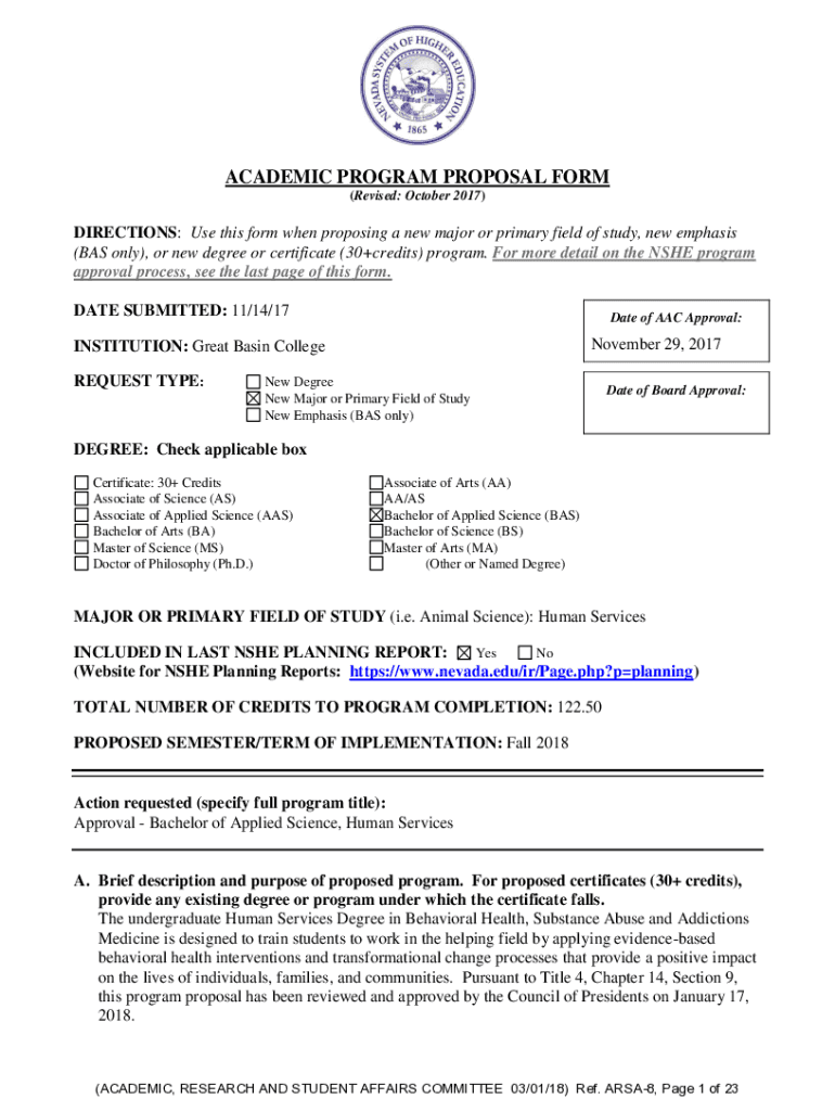ACADEMIC PROGRAM PROPOSAL FORM (Revised: October 2017)DIRECTIONS: Use this form when proposing a new major or primary field of study, new emphasis (BAS only), or new degree or certificate (30+credits)