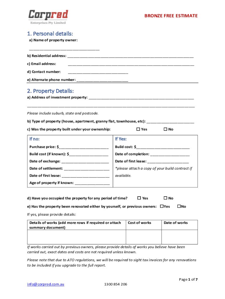 BRONZE FREE ESTIMATE1. Personal details: a) Name of property owner: ___ b) Residential address: ___ c) Email address:___d) Contact number:___e) Alternate phone number: ___2. Property Details: a) Address
