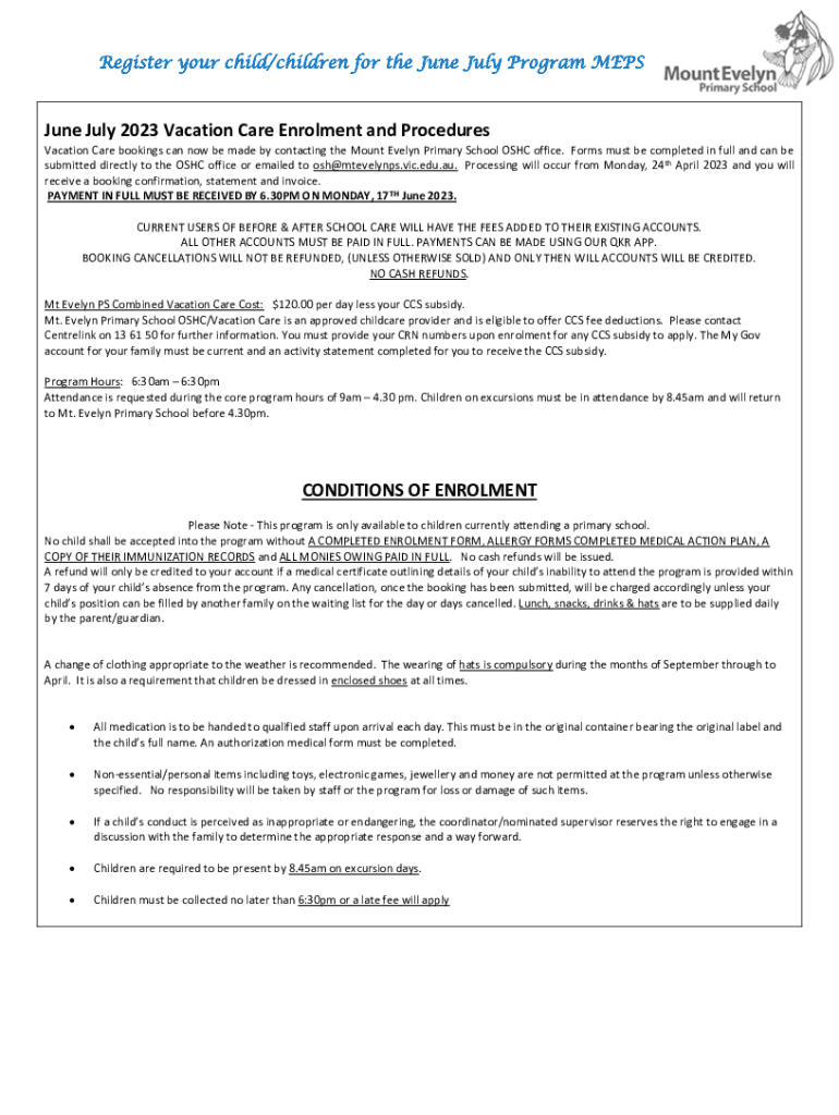 Register your child/children for the June July Program MEPSJune July 2023 Vacation Care Enrolment and Procedures Vacation Care bookings can now be made by contacting the Mount Evelyn Primary School