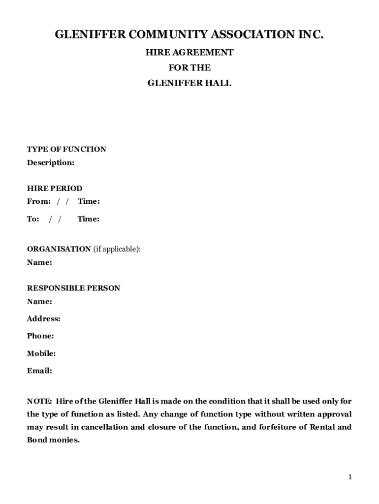GLENIFFER COMMUNITY ASSOCIATION INC. HIRE AGREEMENT FOR THE GLENIFFER HALLTYPE OF FUNCTION Description: HIRE PERIOD From: / /Time:To:Time:/ /ORGANISATION (if applicable): Name: RESPONSIBLE PERSON