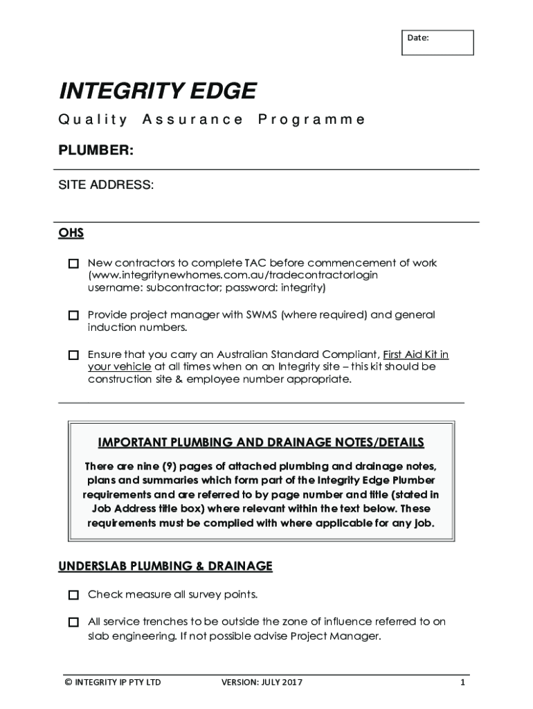 Date:INTEGRITY EDGE QualityAssuranceProgrammePLUMBER: SITE ADDRESS:OHSNew contractors to complete TAC before commencement of work (www.integritynewhomes.com.au/tradecontractorlogin username: subcontractor;
