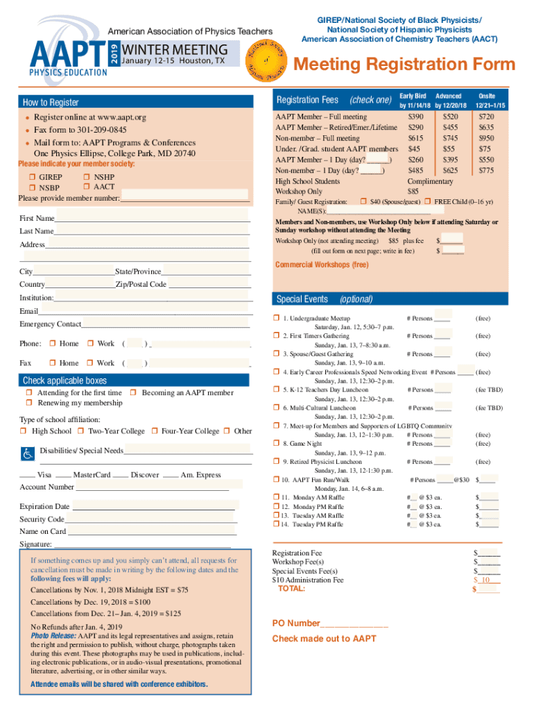 2019American Association of Physics TeachersWINTER MEETINGMeeting Registration Form January 1215 Houston, Registration Peepshow to Register online at www.aapt.org