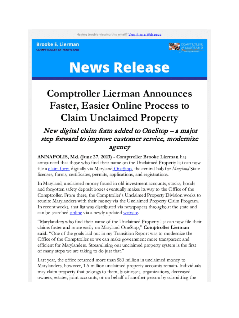 New digital cl aim form added to OneStop a maj or step forwar d to im prov e c us tom er s ervice, moderniz e agencyHaving trouble viewing this email? View it as a Web page.Comptroller Lierman Announces