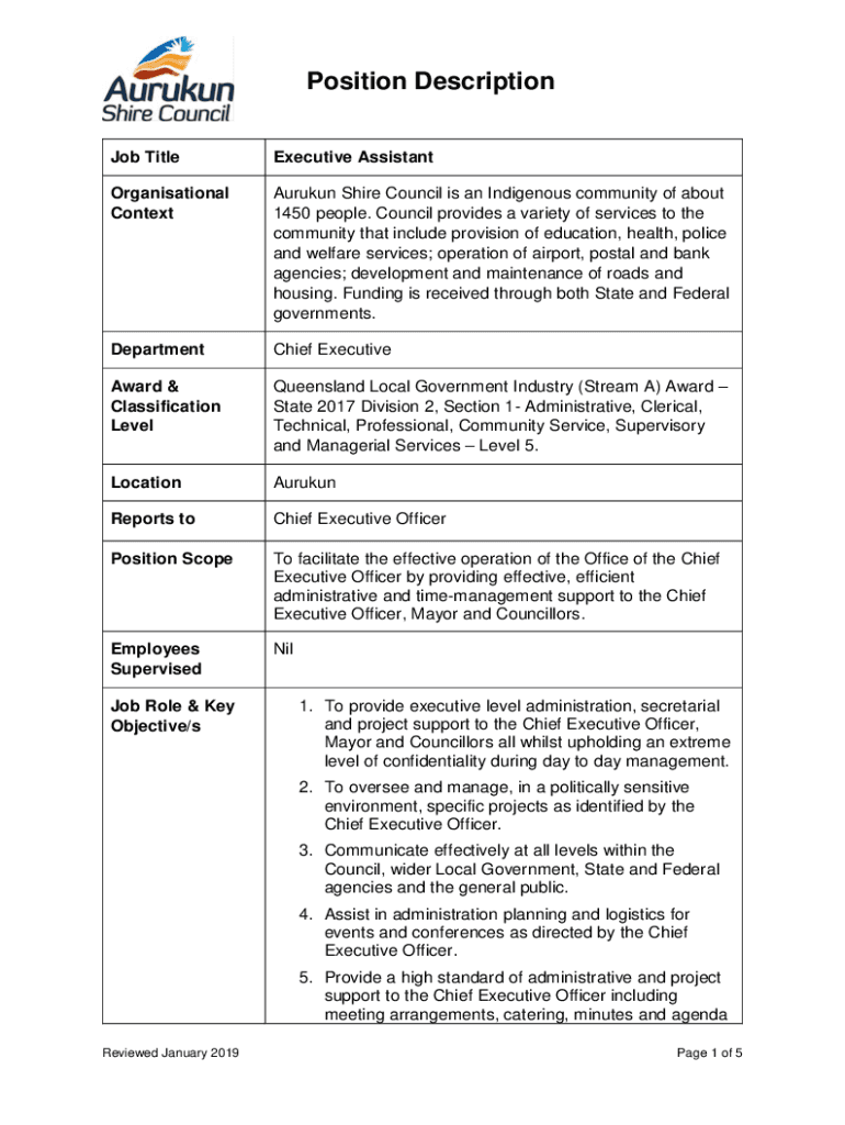 Position Description Job TitleExecutive AssistantOrganisational ContextAurukun Shire Council is an Indigenous community of about 1450 people. Council provides a variety of services to the community