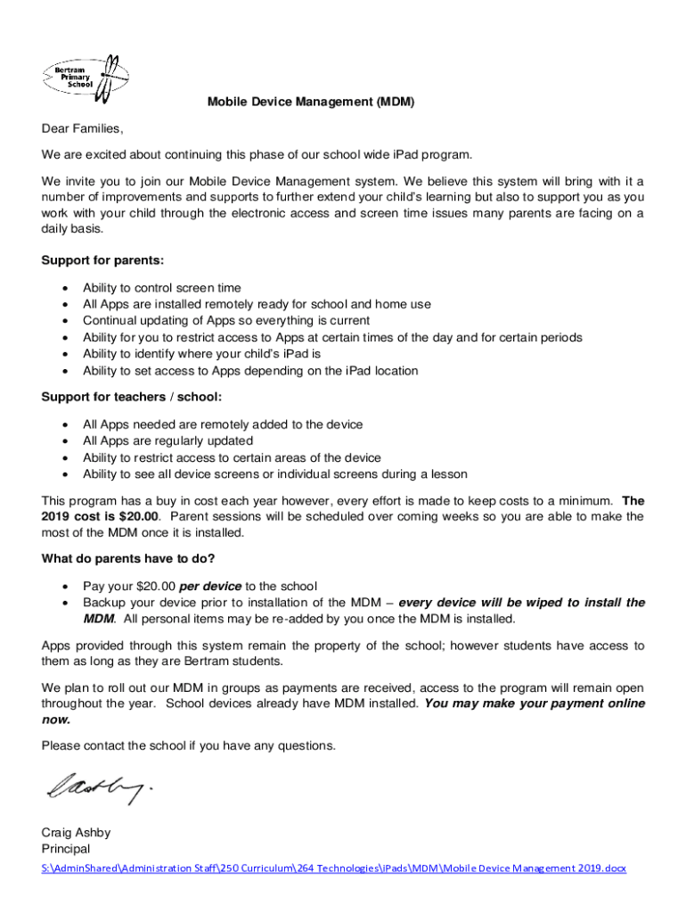 Mobile Device Management (MDM) Dear Families, We are excited about continuing this phase of our school wide iPad program. We invite you to join our Mobile Device Management system. We believe this