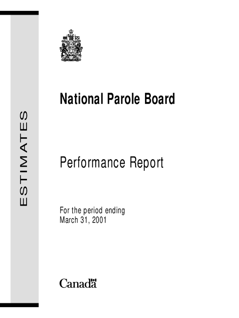 E S T I M AT ES National Parole BoardPerformance Report For the period ending March 31, 2001Improved Reporting to Parliament Pilot Document Each year, the government prepares Estimates in support