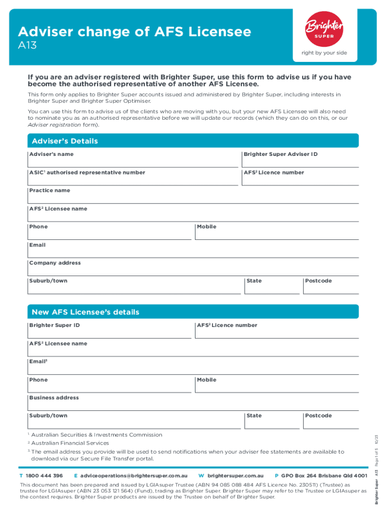 Adviser change of AFS LicenseeA13If you are an adviser registered with Brighter Super, use this form to advise us if you have become the authorised representative of another AFS Licensee. This form