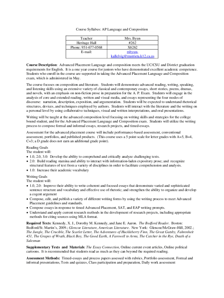 Course Syllabus: AP Language and Composition Teacher Heritage Hall Phone: 9516770568 Email:Mrs. Byun #262 X6262 mbyunkallelvig@murrieta.k12.ca.usCourse Description: Advanced Placement Language and