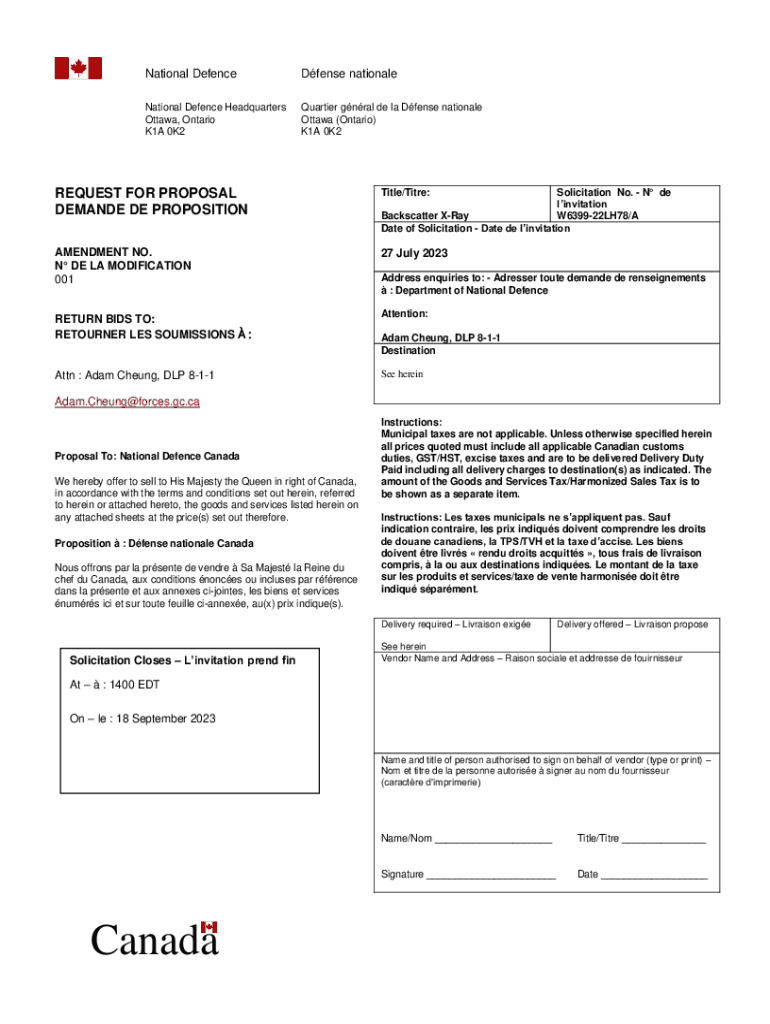 National DefenceDfense nationaleNational Defence Headquarters Ottawa, Ontario K1A 0K2Quartier gnral de la Dfense nationale Ottawa (Ontario) K1A 0K2REQUEST FOR PROPOSAL DEMANDE DE PROPOSITIONTitle/Titre:AMENDMENT