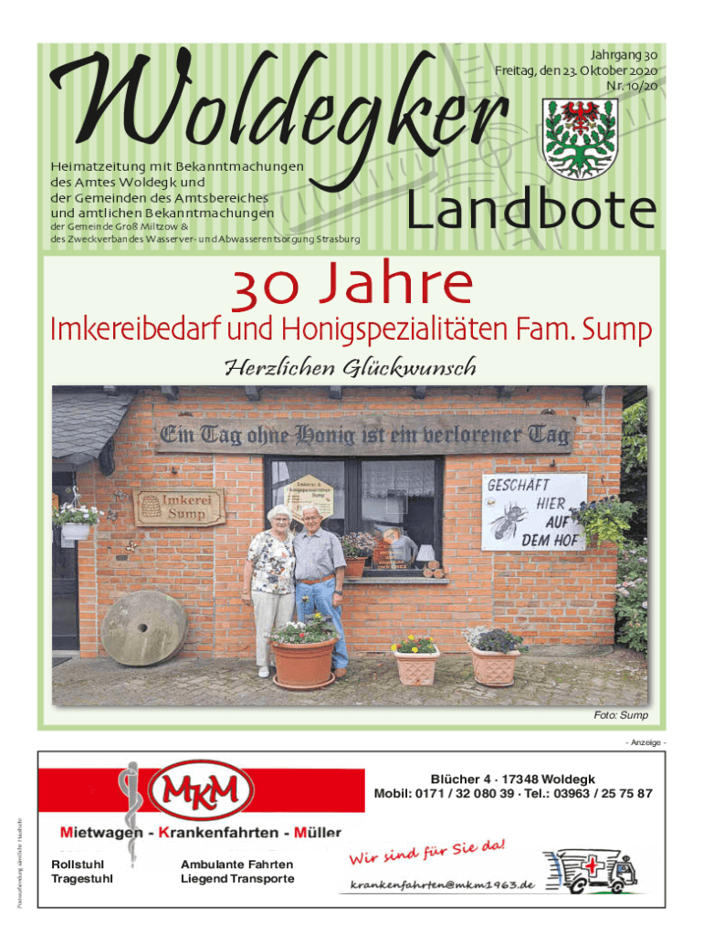 WoldegkerJahrgang 30 Freitag, den 23. Oktober 2020 Nr. 10/20Heimatzeitung mit Bekanntmachungen des Amtes Woldegk und der Gemeinden des Amtsbereiches und amtlichen BekanntmachungenLandbote 30 Jahreder