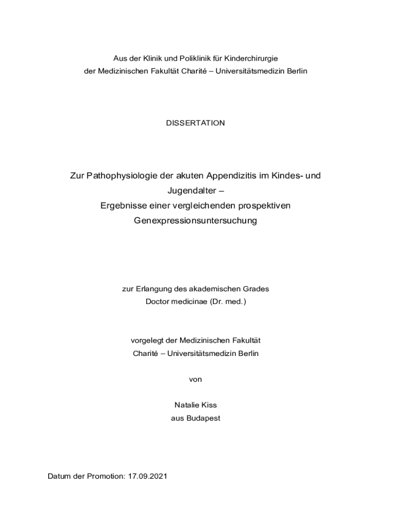 Aus der Klinik und Poliklinik fr Kinderchirurgie der Medizinischen Fakultt Charit Universittsmedizin BerlinDISSERTATIONZur Pathophysiologie der akuten Appendizitis im Kindes und Jugendalter Ergebnisse