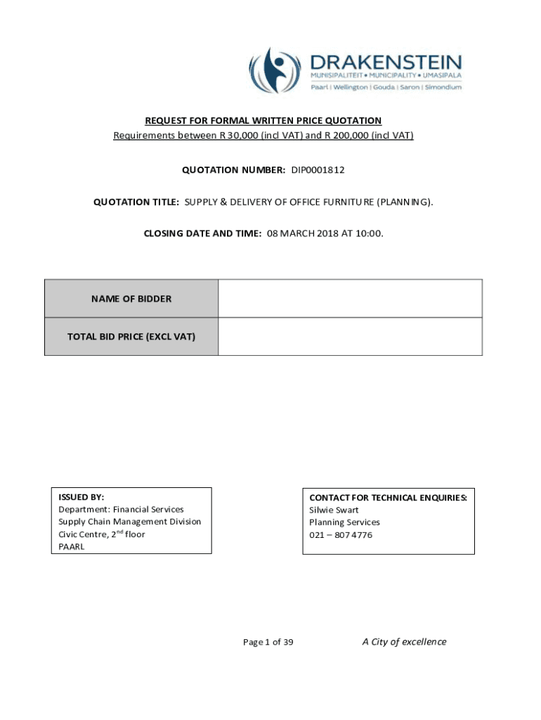 QUOTATION TITLE: SUPPLY & DELIVERY OF OFFICE FURNITURE (PLANNING).