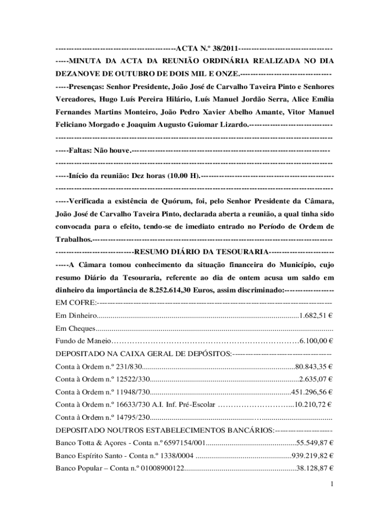 ACTA N. 38/2011MINUTA DA ACTA DA REUNIO ORDINRIA REALIZADA NO DIA DEZANOVE DE OUTUBRO DE DOIS MIL E ONZE.Presenas: Senhor Presidente, Joo Jos de Carvalho Taveira Pinto e Senhores Vereadores, Hugo