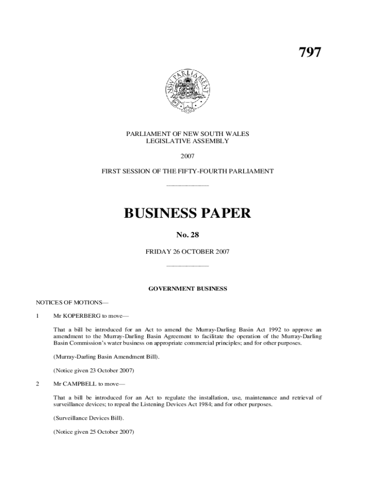 797PARLIAMENT OF NEW SOUTH WALES LEGISLATIVE ASSEMBLY 2007 FIRST SESSION OF THE FIFTYFOURTH PARLIAMENT ___BUSINESS PAPER No. 28 FRIDAY 26 OCTOBER 2007 ___GOVERNMENT BUSINESS NOTICES OF MOTIONS 1Mr