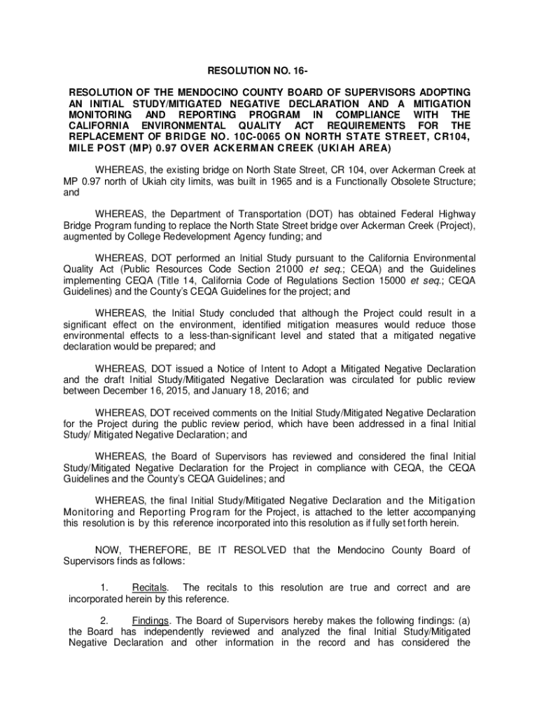 RESOLUTION NO. 16RESOLUTION OF THE MENDOCINO COUNTY BOARD OF SUPERVISORS ADOPTING AN INITIAL STUDY/MITIGATED NEGATIVE DECLARATION AND A MITIGATION MONITORING AND REPORTING PROGRAM IN COMPLIANCE WITH