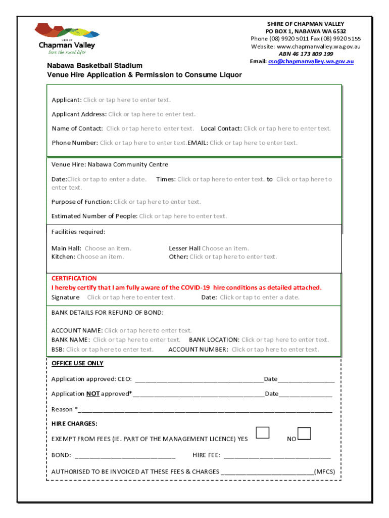 Nabawa Basketball Stadium Venue Hire Application & Permission to Consume LiquorSHIRE OF CHAPMAN VALLEY PO BOX 1, NABAWA WA 6532 Phone (08) 9920 5011 Fax (08) 9920 5155 Website: www.chapmanvalley.wa.gov.au