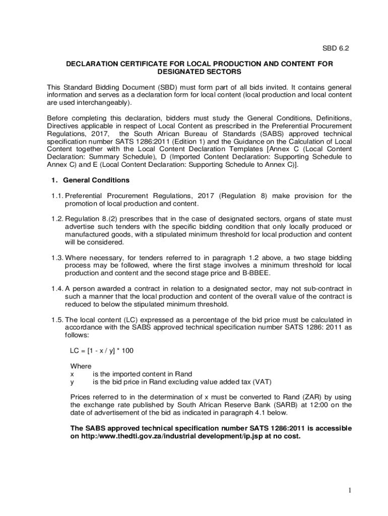SBD 62 Local Content is a standard bidding document used to assess and verify local content requirements in various sectors, ensuring compliance with local legislation and promoting local economic development.