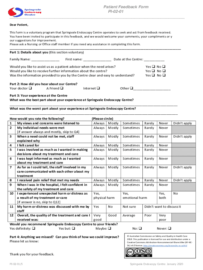 Patient Feedback Form PI0201___ Dear Patient, This form is a voluntary program that Springvale Endoscopy Centre operates to seek and act from feedback received. You have been invited to participate