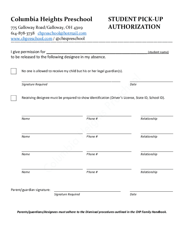 Columbia Heights Preschool 775 Galloway Road/Galloway, OH 43119 6148783738 chpreschool@hotmail.com www.chpreschool.com / @chtspreschoolSTUDENT PICKUP AUTHORIZATION ___******************************************************************************************************************************************I